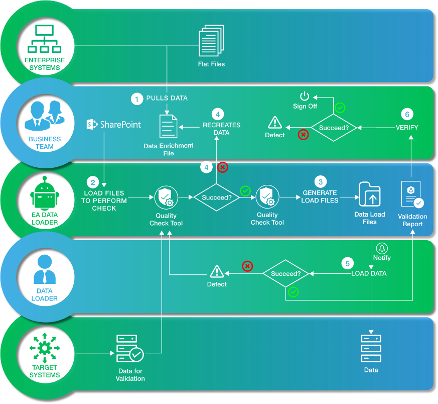 The Data Loader automates the workflow to perform the tasks in data quality checking process performed by Functional Data Analyst role. This also enables configurations of new validation rules or changing the existing validation rules.