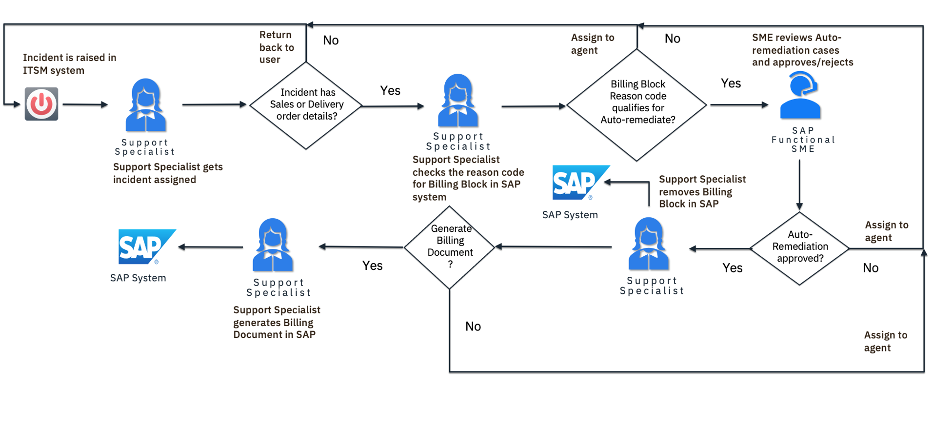 O2C Incident Manager Automates the workflow of Incident Management process. Below the an illustrative example of workflow for Billing Block related issues. Digital Worker will fetch the incident, analyze to detect if billing block issue, identify the reason code and take necessary remediation action as per business rules.