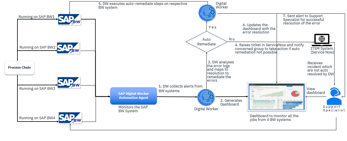 BW Process Chain Monitor automates the workflow for centralized monitoring of BW process chain failures and long running BW process chains from multiple SAP BW systems. This Digital Worker intercepts process chain issues, analyses the issues, figures out remediation steps for error scenarios where auto remediation is possible. It displays dashboard with real time process chain status and integrates with SAP BW system(s) for executing remediation steps.